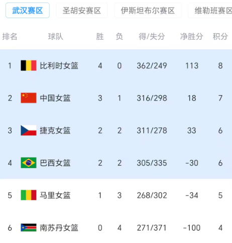 北京时间3月15日晚上,女篮世界杯预选赛小组赛武汉赛区第四轮全部结束,中国女篮84-74险胜捷克女篮、比利时女篮102-64大胜南苏丹女篮、巴西女篮76-73击败马里女篮。至此,中国女篮提前一轮出线、南苏丹女篮提前一轮出局。