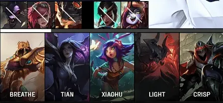 WBG选用:Breathe剑魔;Tian劫;Xiaohu沙皇;Light卡莎;Crisp妮蔻